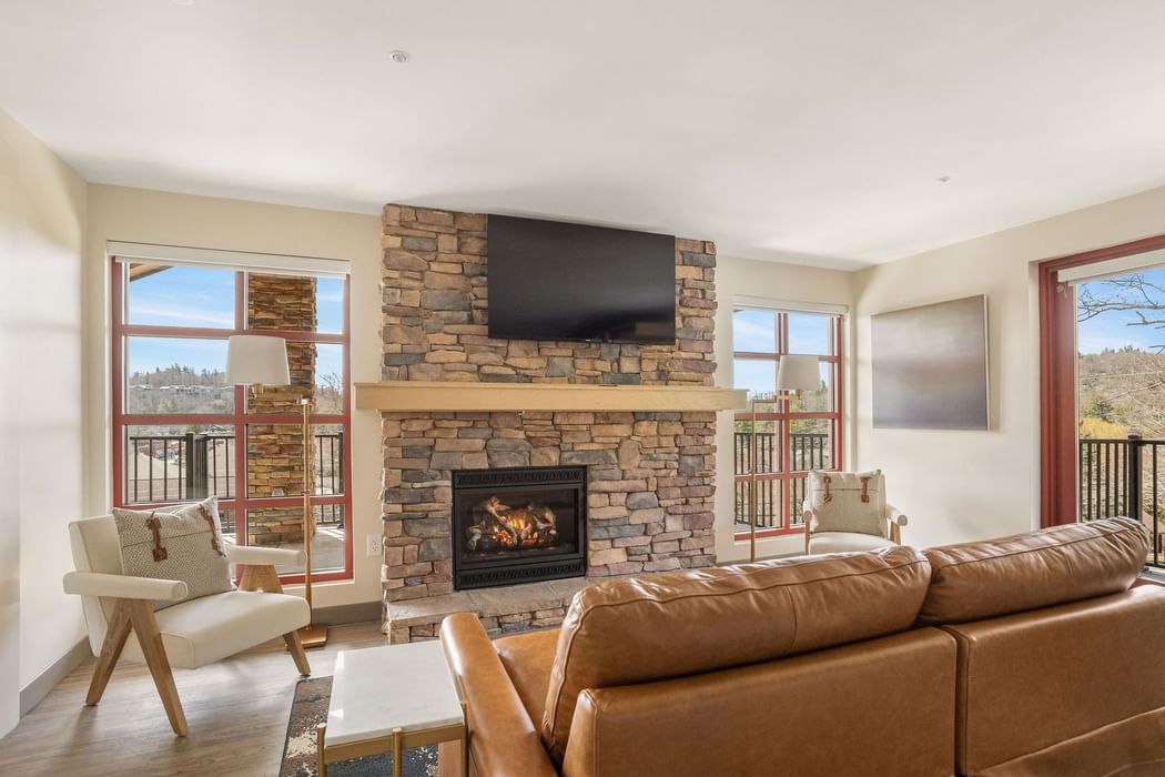 The Appalachian Grand Suite, on the top floor, offers stunning views of downtown Blowing Rock. It includes a living room with a queen sofa bed, wet bar, and a large balcony with two glide and swivel Adirondack chairs, lounge seating, a dining table, a king-size bedroom, a fireplace, and an additional private balcony.