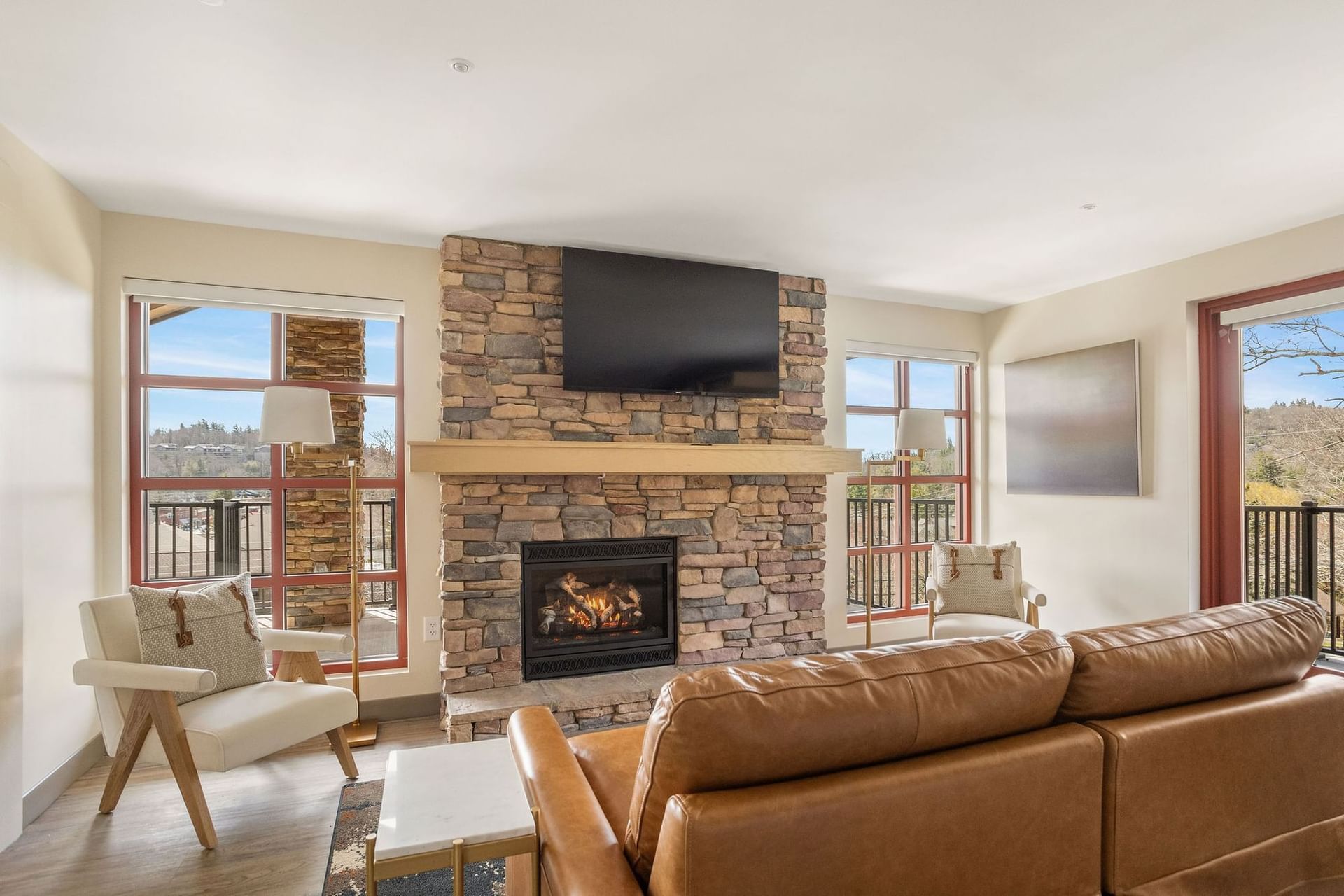 The Mayview Grand Suite offers stunning views of downtown Blowing Rock. It includes a living room with a queen sofa bed, wet bar, and a large balcony with two glide and swivel Adirondack chairs, lounge seating, and dining table.